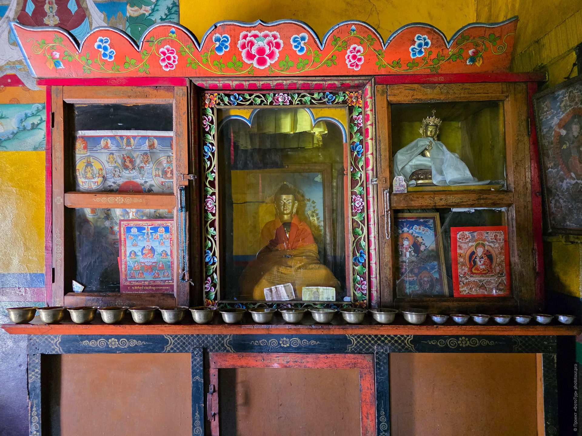 В лхаканге стоит небольшой шкаф, за стеклянными окнами скульптуры Будды Шакьямуни и Тары, на полочке чаши с чистой водой - подношение, по стенам развешаны фотографии учиталей и тханки - все очень просто и - очень ухожено, то, что этот лхаканг принадлежит женской гонпе - однозначно веет с каждого кусочка пространства, и даже четки, висящие на ручке шкафа - нежно голубые.
