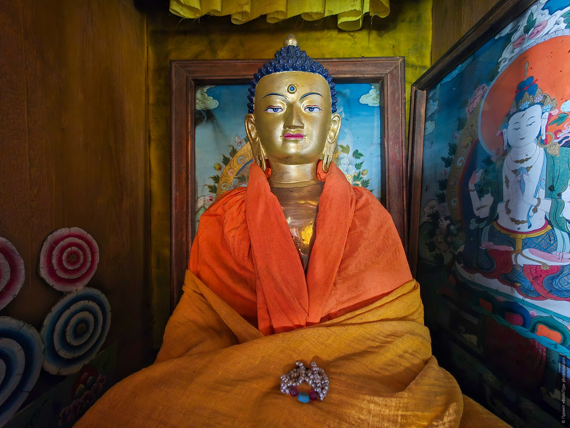 на чёгу (верхняя желтая ритуальная накидка) Будды Шакьямуни лежит, как подношение, женское украшение, мы много такого увидим еще внутри Таши Чолинг Гонпы.