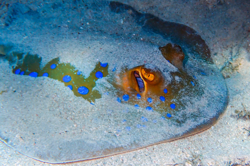 Голубой пятнистый хвостокол — одно из тех подводных существ Красного моря, с которыми встреча ощущается как личный подарок.