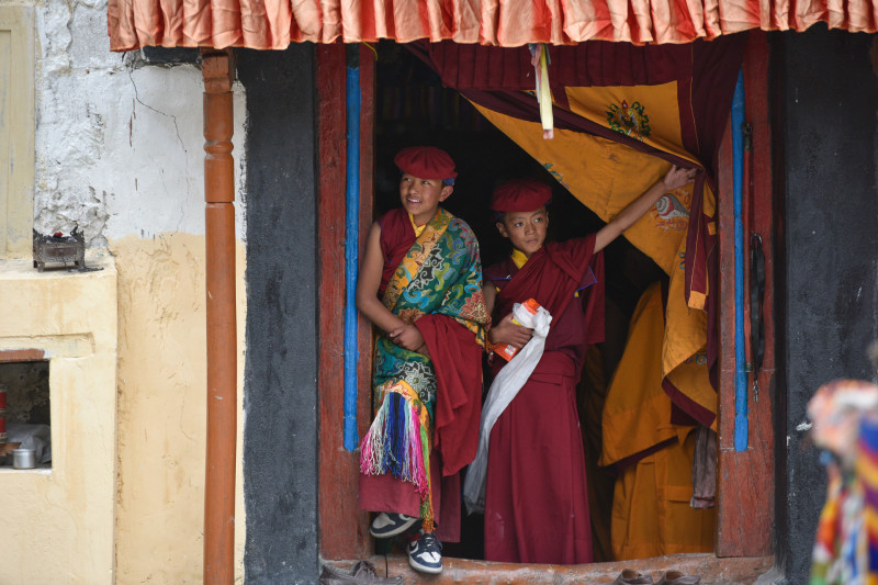 - местные, ладакхи немного слушают пуджи, а в это время внутри гонпы читаются тантрические пуджи, очень много простираются перед святынями - старыми тханками и изображениями Защитников, которые открываются только в дни праздников, совершают подношения, просят благословения у лам.