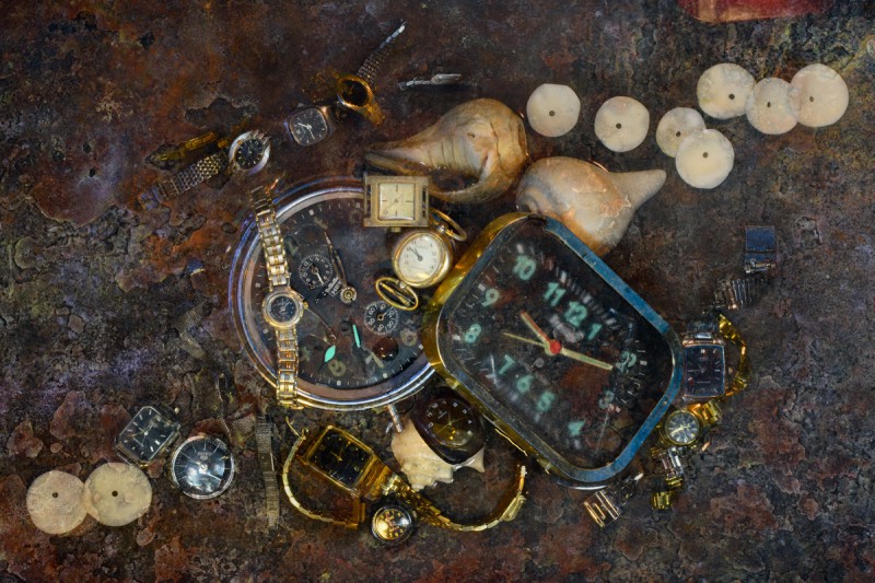 С этим Черным Временем тоже свои забавы: этот натюрморт собирался долго и активно не получился. Сначала нам стали попадаться черные старые будильники, потом собрались поломанные черные часики, потом вроде бы они и в корытце с водой разложились, но уже стемнело, я вытащила лампы, но свет - не нравился и я оставила стоять корытцо с часами до утра. Утром следующего дня - погуляла вокруг корытца, поразглядывала и решила - пусть еще постоит, может чего и изменится? Не изменилось: дни шли чередом, у нас начался сентябрьский фототур "Легенды Тибета" и корытце с часами на террасе никого не беспокоило, напротив - на нем можно было мимоходом уходить в медитацию, или просто разглядывать - что не так? Идей, однако, новых не приходило, и даже чего-то подвигать туда-сюда в корытце - не хотелось. Вода несколько раз высыхала - я подносила новую, аккуратненько заливала и терпеливо ждала каких-нибудь изменений или новых идей. Я даже не убрала штатив с террасы, просто отстегнула с площадкой Никон, всегда готовая в любой момент вернуться назад.