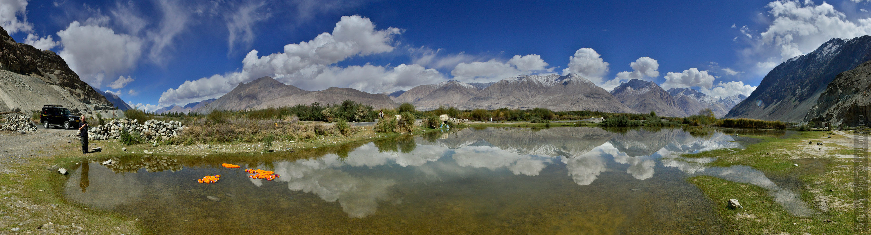 Сняты эти открыточки в нережимное время и очень на ходу: группа была в Дискит Гонпе, а я на своем джипе скакала по близлежащей части долины в поисках съемочных луж. Время нас поджимало - после обеда в обратный путь в Лех, а вот хоть несколько фотографий с отражениями очень хотелось.