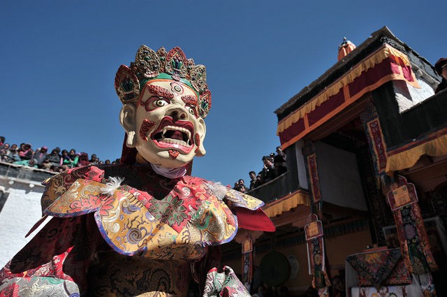 Кстати, ритуальный танец Цам танцуют ламы, переодетые в торжественные костюмы и маски с изображением богов. Это делается для того, чтобы создать впечатления присутствия богов среди паломников и верующих.
